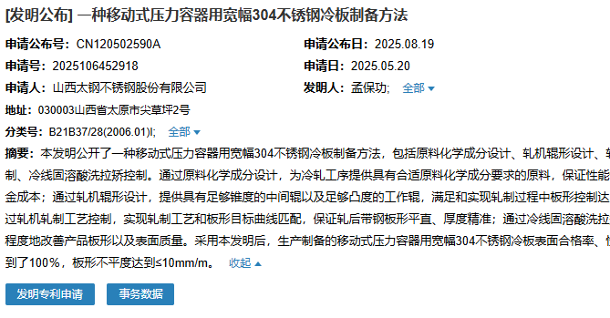 8月19日,山西太鋼不銹鋼股份有限公司成功申請(qǐng)一項(xiàng)名為“一種移動(dòng)式壓力容器用寬幅304不銹鋼冷板制備方法”專利,申請(qǐng)公布號(hào)為CN120502590A,申請(qǐng)日期為2025年5月20日。