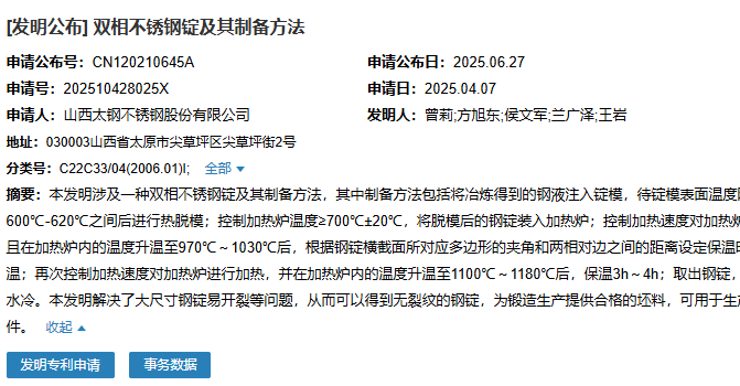 時(shí)間:06/27/2025 03:10:342025年6月27日,山西太鋼不銹鋼股份有限公司成功申請(qǐng)一項(xiàng)名為“雙相不銹鋼管坯及其制備方法”專利,申請(qǐng)公布號(hào)為CN120210688A,申請(qǐng)日期為2025年4月7日。